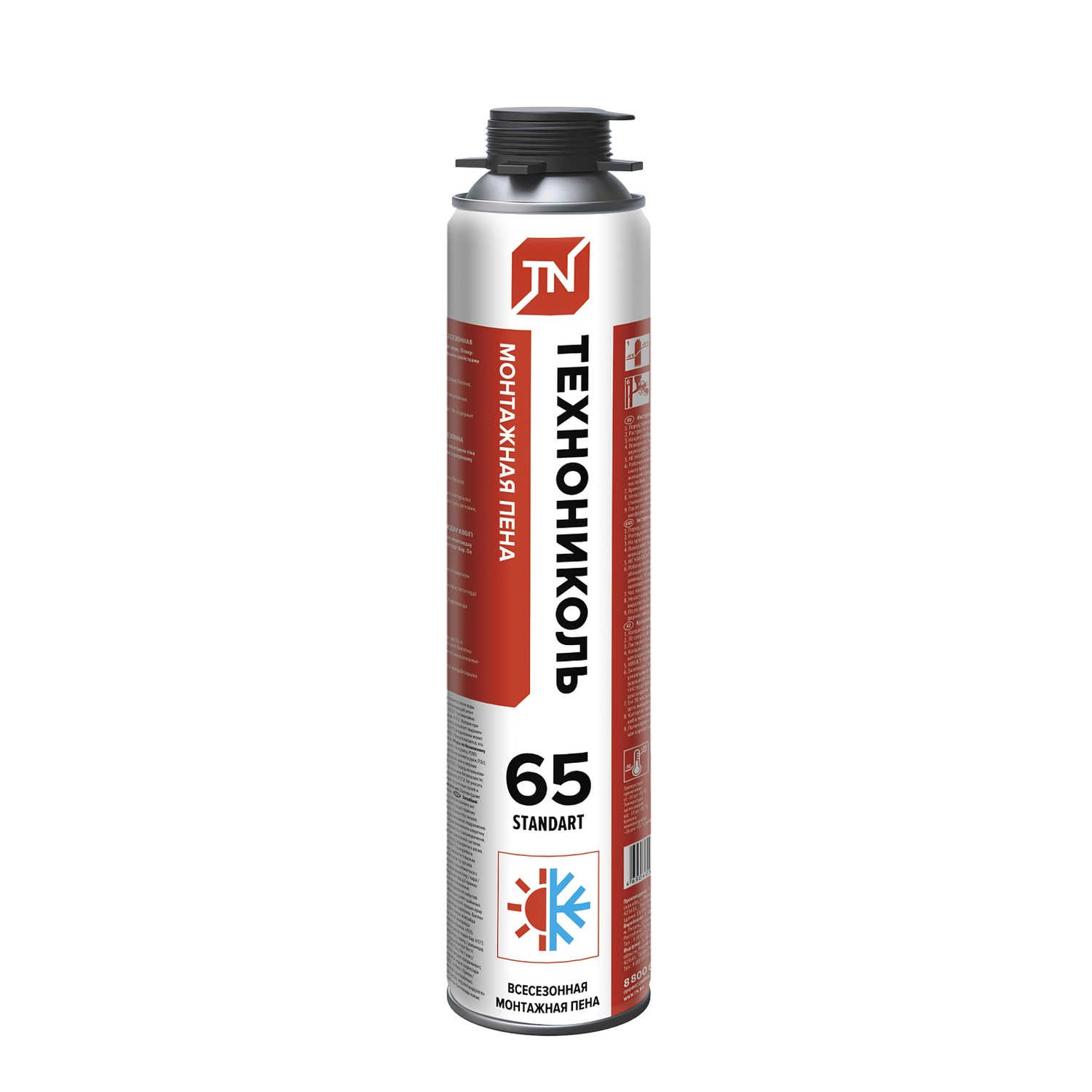 Пена монтажная ТехноНиколь 65 STANDART всесезонная представляет собой однокомпонентный полиуретановый материал в аэрозольной упаковке. Монтажная пена отличается высокой эластичностью, контролируемым объемом монтажного валика, высокими показателями тепло- и звукоизоляции, активным первичным и умеренным вторичным расширением. Пена обладает хорошей адгезией к большинству строительных материалов, за исключением фторопласта, силикона и полиэтилена.