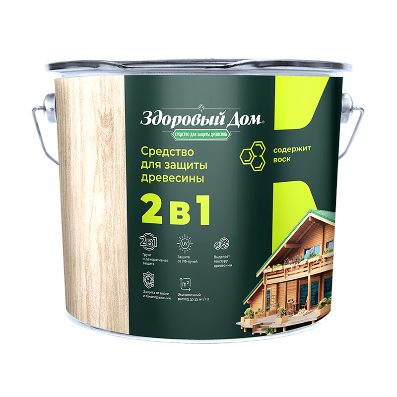 штДеревозащитное средство Здоровый дом 2 в 1 дуб 9 л представляет собой высокоэффективное покрытие для декоративной отделки древесины и защиты поверхностей на срок до 8 лет. Формула 2 в 1 позволяет наносить состав без предварительного использования грунта.