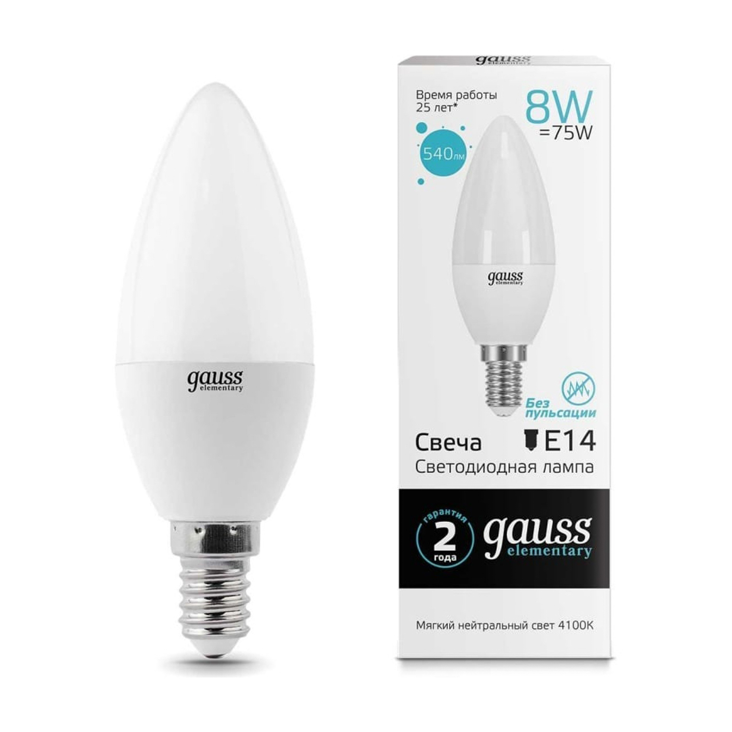 Лампа светодиодная Gauss Elementary, Е14, свеча, 8 Вт, 540 Лм, 4000 К, нейтральный белый
