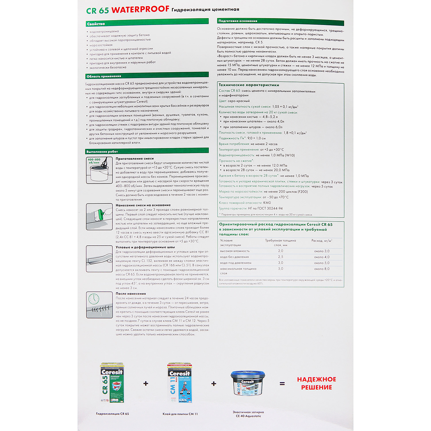 Для устройства водонепроницаемых покрытий на недеформирующихся трещиностойких незасоленных минеральных не содержащих гипс основаниях, внутри и снаружи зданий: