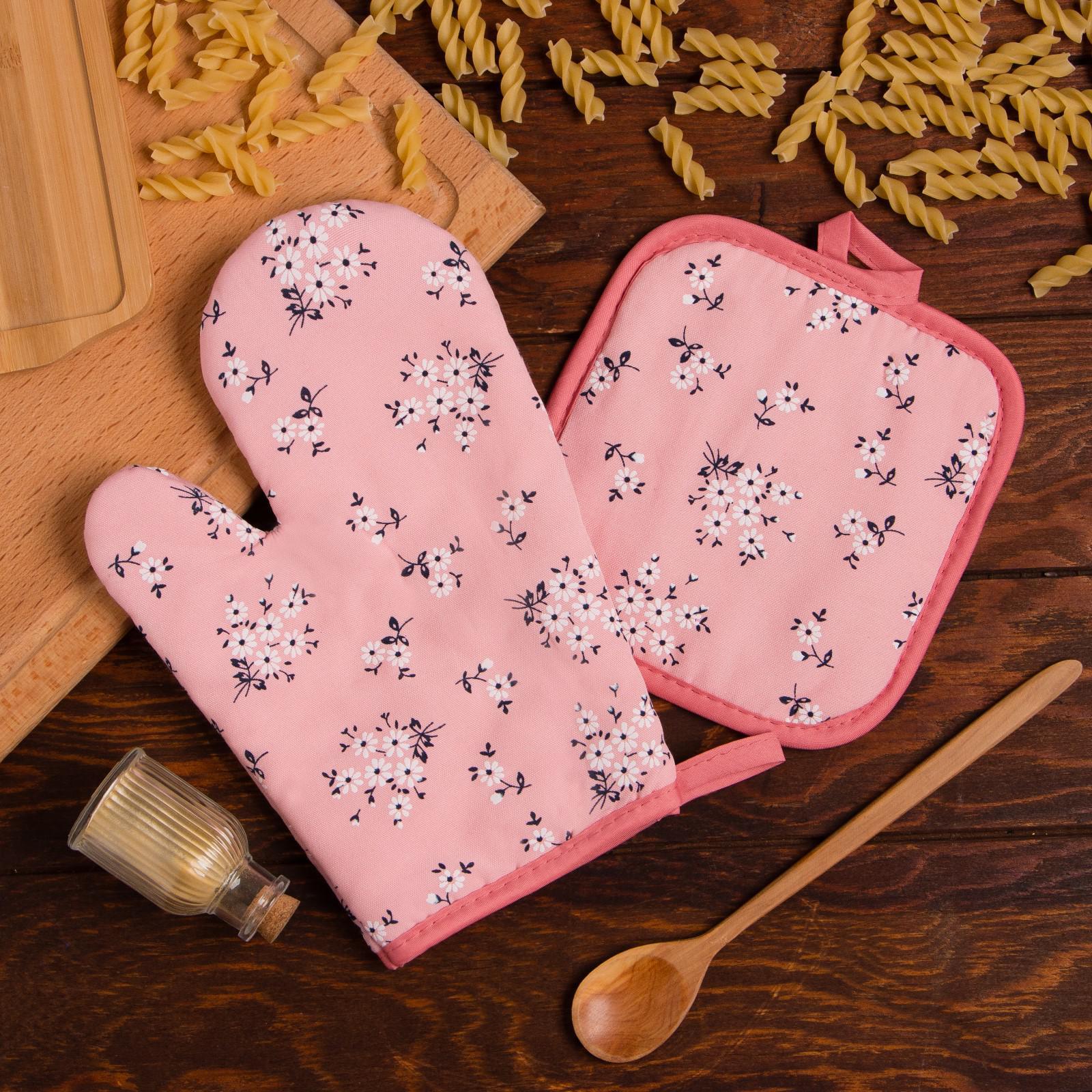 Набор прихваток Цветы на розовом варежка-прихватка 26х16см, прихватка 17х17см, п/э 100% Доляна *1