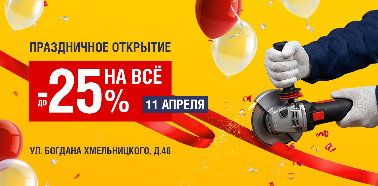 Празднуем открытие нового магазина ДомоСтрой в Миассе 11 апреля по адресу ул. Богдана Хмельницкого, д.46! И в честь этого праздника дарим скидку до -25%.